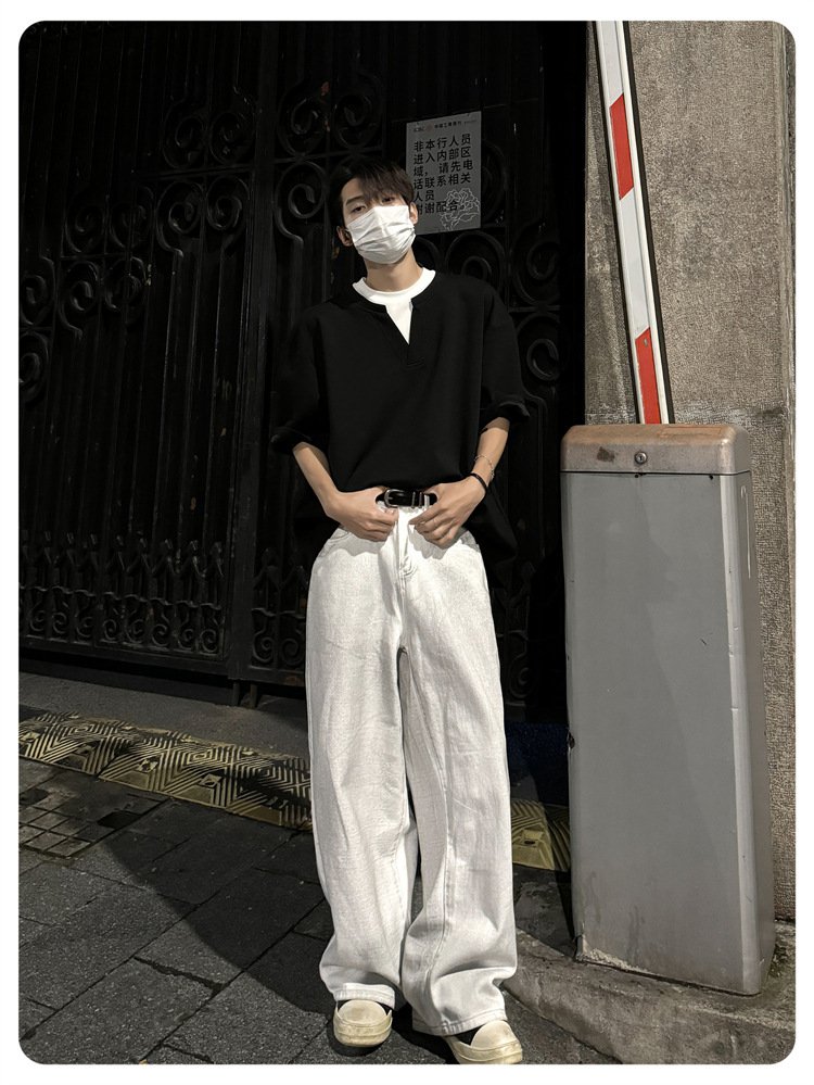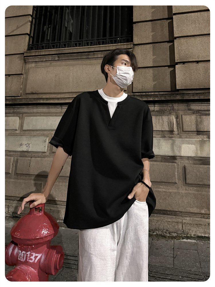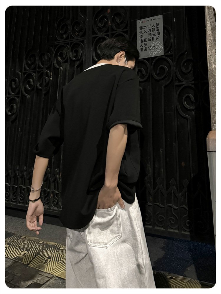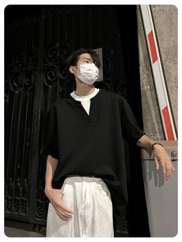 夏のニッチなデザインコントラストカラーフェイクツーピース半袖Tシャツメンズ万能ルーズスプライシングVネック半袖トップス